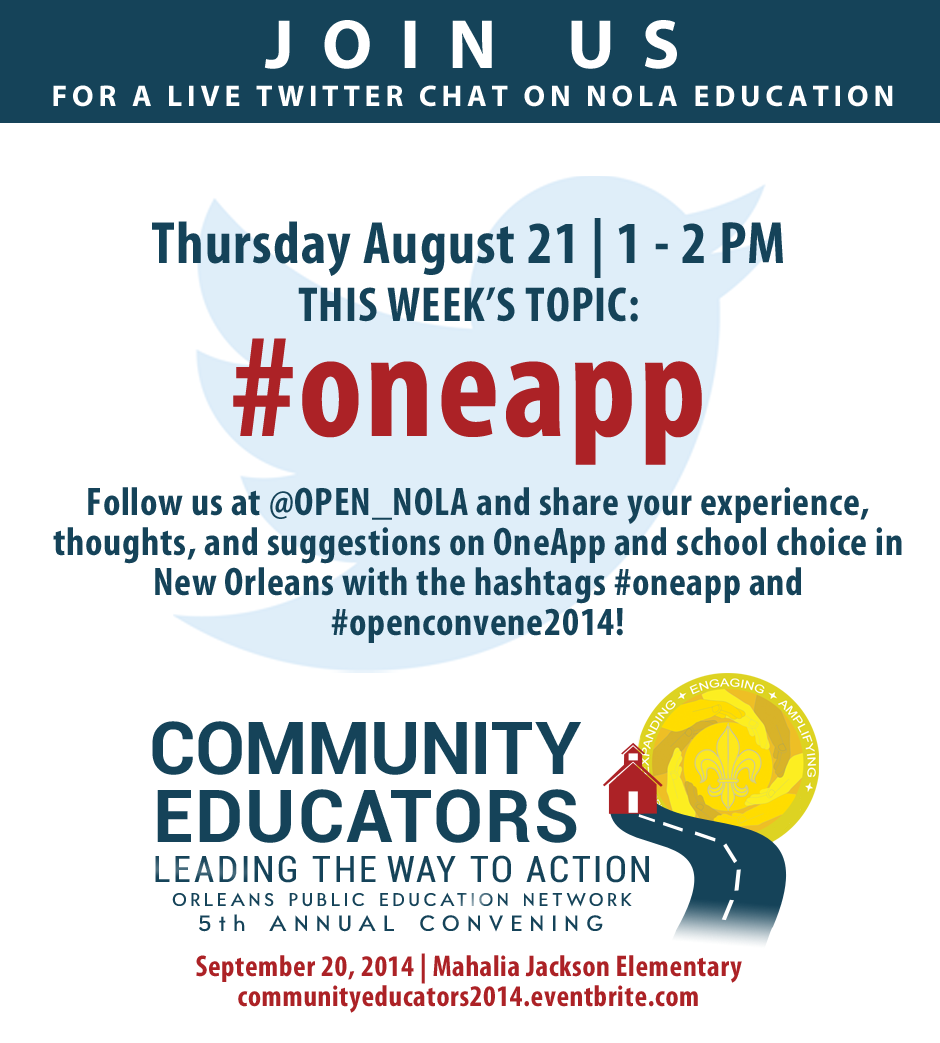 In preparation for our 2014 OPEN Convening, we’re hosting weekly Twitter chats on the most pertinent issues in education today. Want to join in with the conversation? Follow us @OPEN_NOLA and make sure to tune in to this week’s hashtags!